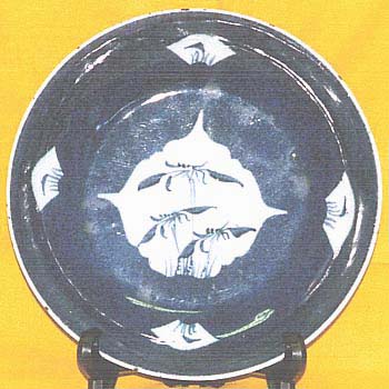 灑藍釉地留白青花蘭花文深皿(清初期時代、AD1644〜1795)