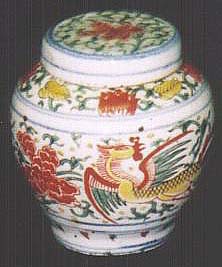 倣明青花五彩牡丹鳳凰文有蓋小壺(清初期時代、AD1644〜1795)