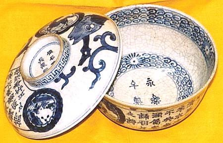 蓋高3.4cm、蓋口径13.5cm、碗高7.2cm、碗口径12.7cm、 底径5.8cm、在銘、永樂年製(青花楷書二行款) 見込みに永樂年製の倣款を入れ、碗の外面に詩文を書くのは、天啓 年間(1621〜1627)に景徳鎭で作られた「赤壁賦図碗」が有名であ るが、本品は、胎土に白化粧を施して青花で絵付けし、その上から透 光性の強い上薬がかけられて、貫入の入った樣は一見哥釉地の様に 見えるが、むしろ表面は硝子の様である。濃青の青花で簡略化した明 末の紋様が描かれている点から考えるに、清末吉州窯の天啓写しと思 われるが、或いは明末の吉州窯青花碗かもしれない。尚、蓋は碗と会 わず後家蓋であるが、蓋の中央と高台内には、共に「m石城昴龍乾」 の銘が書かれている。 |