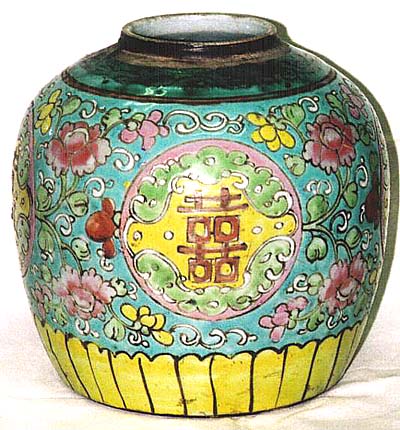 湖緑地滿彩雙喜牌文罐(同治年間、AD1862〜1874)