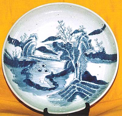 豆青釉青花山水文盤(乾隆年間、AD1736〜1795)