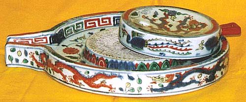 高さ5.6cm、中央外径22cm、中央内径11.7cm、横26cm 在銘、大明萬暦年製(楷書青花款) 引き臼を磁器で模した玩具で、実際に何かが粉に出きる訳ではないが、遊び 心として面白い。本品は、釉薬中の気泡状態は清朝末風であるが、赤絵の色 調が明らかに民国時代の色調である。尚、注ぎ口は折れているが裏に磁土を 塗り二度焼きして繋ぎ、上部の回し手も折れたものを繋ぎ、その上から別の赤 色がかけられており、要するに、破損品の補修品である。 |
