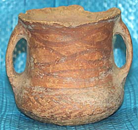高さ8.7cm、口径8.6cm、底径6.4cm 欠けを施しわざとらしい古色が付けてあるが、こ の様な形態(底張りで筒首でしかも双耳)の壺は 寡聞にして見たことが無い。弦文も異なり、耳の ランスバも悪く、全体の形も可笑しい。まるで馬家 窯文化半山系(BC2600〜2250)の双耳壺の 底部を低くし、馬家窯系(BC3500〜3000)の 弦紋を描き、更に斉家系(BC2100〜1300)の 大双耳を付けた形で、馬家窯文化の各系の特徴 を繋ぎ合わせた趣きである。馬家窯文化の品と言 えば確かに馬家窯文化ではあるが、現代倣品のお 土産ものであろう。 平成21年度ゼミ卒業生寄贈品。 |