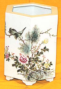 粉彩花鳥文六角形筆筒(民國17年、AD1928) |