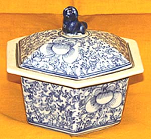 青花淡描纏枝牡丹文有蓋狗紐六角小罐(道光年間、AD1821〜1850)