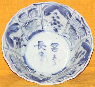 青花芙蓉手富貴長壽文輪花縁鉢(明末期時代、AD1621〜1661)