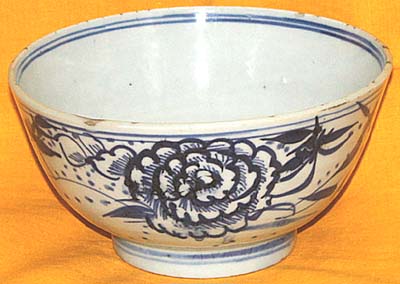 清朝初期の民窯青花中鉢である。口縁に数カ所の虫食い、高