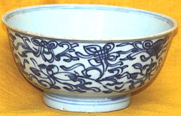 当時の民窯青花碗である。外面には線描で花唐草が描か