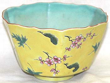 倣乾隆黄釉地粉彩松竹梅文六菱形碗(清末期時代、AD1875〜1911)