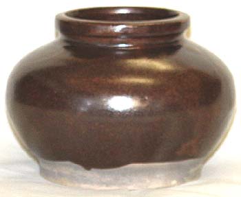 高さ8.9cm、口径7.4cm、腹径12.7cm、底径8.8cm 胴継ぎで造型され、軟らかく目の粗い白土の上に直接 やや茶色じみた褐釉がかけられている。本歌の南宋品 で、同じ形態で、同じ鐵釉系統の柿釉がNO58で、褐釉 である。しかし、本品は、それらを模した清朝後期の品 で、胎土はほぼ同じであるが、口縁や高台の形態、及び 全体のフオルム(胴部の張り具合)等が微妙に異なり、 清朝時代の倣品であることを示している。 |