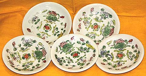 徳化窯粉彩花卉(四君子)文皿五枚(清末期時代、AD1875〜1911)