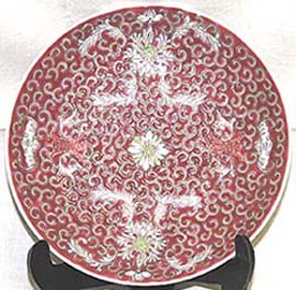 胭脂紅地粉彩花唐草蝙蝠文皿(民國時代、AD1912〜1949)