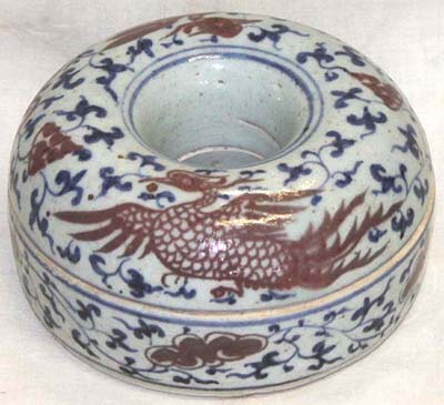 青花釉裏紅鳳凰唐草文環形合子(民國時代、AD1912〜1949)