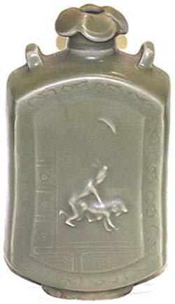 青磁浮彫春宮圖有耳花辨口偏壺(民國時代、AD1912〜1949)