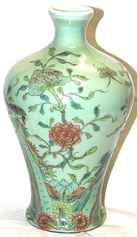 倣清豆青釉粉彩花鳥文梅瓶(民國以後、AD1950〜1990)