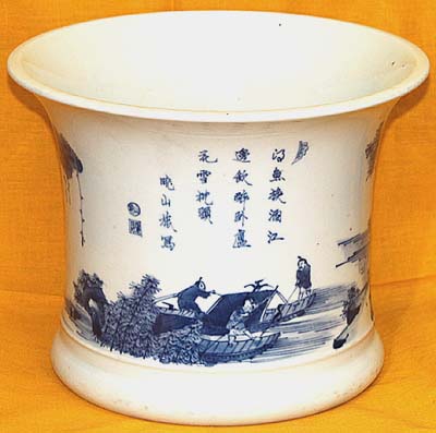 青花山水人物圖詩句文大筆筒(康煕年間、AD1662〜1722)