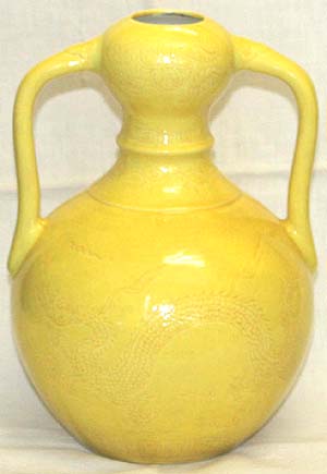 倣明黄釉刻龍文如意耳葫蘆形瓶(現代、AD1990〜2010) |