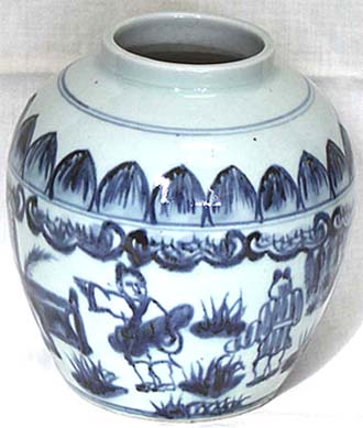 青花抱琴訪友圖壺(民國時代、AD1912〜1949)