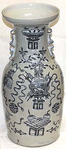 豆青釉青花古玩文獅子耳中瓶(清末期時代、AD1875〜1911)