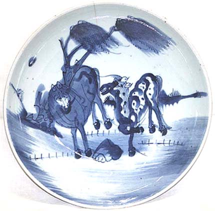 高台内無釉の裏白で、当時の民窯の代表的絵柄の盤である。惜し