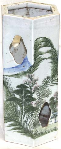 緑彩山水文六角帽筒(民國時代、AD1933)