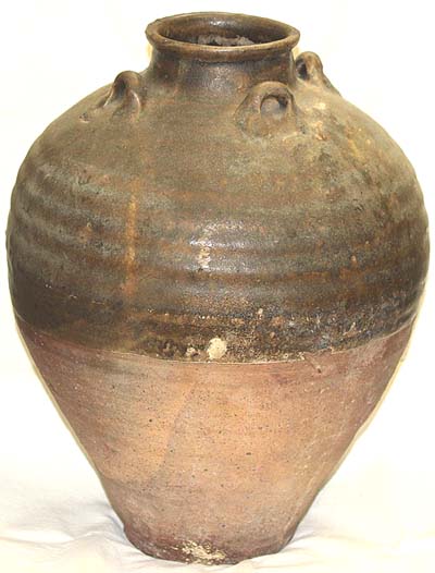 褐釉をかけた大型四耳壺で、中国南部の地方窯で作られた品