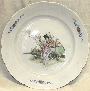 民国時代の代表的絵柄の粉彩皿である。見込みに仕女図