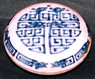 ピンク色の胎土の上に白化粧を施し、その上に青花で龍紋