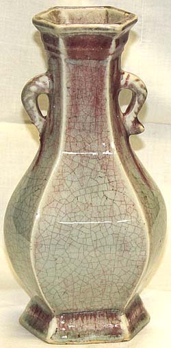 青磁紅釉雙耳六方瓶(民國時代、AD1912〜1949)