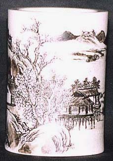 刻瓷墨彩山水文筆筒(清末期時代、AD1875〜1911)