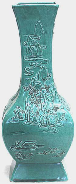 倣乾隆蒼緑釉彫瓷山水文四方瓶(清末期時代、AD1875〜1911)