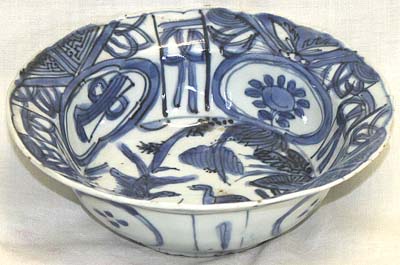 青花芙蓉手雙鳥文輪花縁鉢(明末期時代、AD1621〜1661)