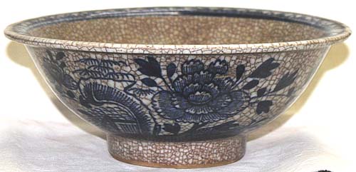 細かい貫入の入った釉薬で、やや明るい青花で牡丹紋様を描いた鉢で、清末