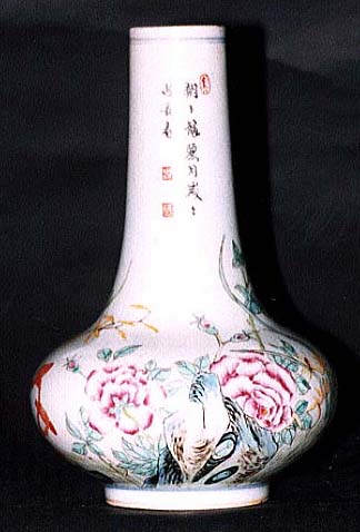 高さ20.7cm、口径4.2cm、頸高13.1cm、腹径13.5cm、 底径7.4cm、在銘、二重丸圏青花大清雍正年製款 形態も絵柄も本物にそっくりであるが、釉調が異なる。また本物の銘文 は大清乾隆年製であり、大きさも手の上に乗る程度の小型である。俗 称「古月軒」(宮中の顔料製造処に胡大有なる人物名が存在したことか ら、この様に呼ばれたらしい)と呼ばれている本歌は、現在台湾故宮博 物院に収蔵されており、その顔料は琺瑯彩で落款は二重角圏宋体藍 料款である。琺瑯彩と粉彩の顔料的相違は、琺瑯彩は顔料中に砒素 と硼素を含むが、粉彩は砒素は含んでも硼素は含まないことである。清 朝後期以後、陸続として倣古月軒物が作られているが、その大半が例 え落款を宋体藍料款で表しても絵付け顔料が粉彩であり、厳密な意味 では「倣古月軒」とは言えず、所詮「倣粉彩古月軒」に過ぎず、将に本 品の如き物がそれである。尚、余談ではあるが、現在宋体藍料款を施 した「倣粉彩古月軒」が大量に出回っている。亦、清末期の「倣粉彩古 月軒」物には、概して青花款の物が多い。 |