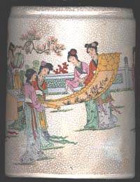 土産品、哥窯仕立ての上に仕女図を描かいた筆筒と、観音図を描いた