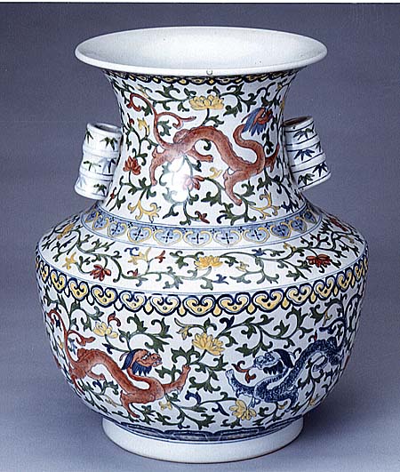 倣乾隆闘彩雨龍唐草文雙耳大壺(清末期時代、AD1875〜1911)