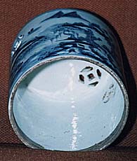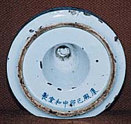 高さ24cm、径17.5cm、蓋高20cm、蓋紐高3cm、紐径5cm、 台座高3cm、台座内油台高11cm、油台径9cm、窗径約3.5cm 在銘、康煕己卯中和堂製 実際に使われた清朝時代の油燈である。上段が本来の姿で 中段が蓋である。蓋の側面と天井に各二づつ合計四個の明 かり窓が一直線上に開けられている。蓋は形態及び釉調等 から明らかに康煕時代のものであるが、油を入れる台座は、 高台内部に上記の如き康煕三十八年の銘が書かれているも のの、清末の写しである。下段が台座であるが、日用品であ るため台座が壊れ、何とか別の合いそうな台座と組み合わせ たものであるが、そのため、蓋と台座とが必ずしもきっちりと 適合している訳ではない。 |