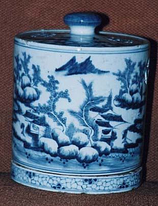 青花山水文有蓋帯承盤油燈臺(清朝時代、AD1644〜1911) |