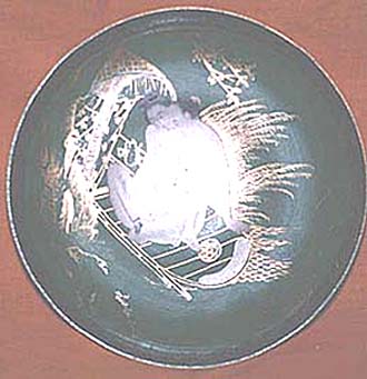 緑地の上に金彩で船や草を描き、人物だけを粉彩で