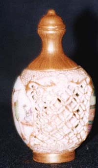 高さ8cm、胴径4.5cm、底径2.3cm 在銘、古月軒(赤色後付け) 所謂鼻煙壺に仕立てられた轉心瓶で、内側の小瓶が回転 する。外瓶・内瓶共に春宮圖が描かれており、外瓶の鏤空 部分から覗いて内瓶を回転させれば、内瓶春宮圖も見える と言うしろものであるが、本来の轉心瓶とは作り方が些か異 なる爲に、「倣轉心瓶」としか呼べない。粉彩の釉調・図柄 には清末民初の風が窺えるが、現代物であろう。尚、古月 軒とは道光以後に主に鼻煙壺に使われる堂齋名である。 |