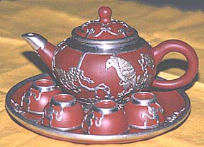 宜興窯の茶器に錫を巻き付けて飾ったもので、現代のお