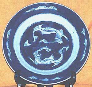 藍地留白淡描雙龍文盤(康煕年間、AD1662〜1722)