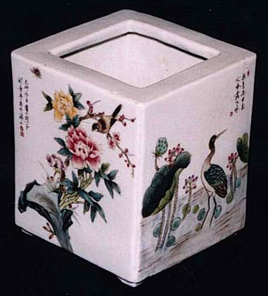 粉彩花鳥文角形委角筆筒(民國28年、AD1939) |