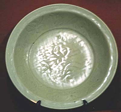 元様式の流れを汲む堂々たる大振りの青磁刻花紋皿である。