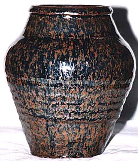 高さ16.3cm、口径8.3cm、肩径13.5cm、底径・・7.3cm 黒釉醤斑ものは、宋から元末にかけて各地(陝西耀州 窯・山西渾源窯・河北磁州窯・河南修武窯・福建建窯 等)で製造されているが、本品は巻き上げ形式で生成 され、その胎土は、やや粗めの灰白色で同時に多くの 細砂粒を含んでおり、磁州窯系ほどの粗い土質の灰 色ではなく、修武窯系ほどのきめ細かい黄白色でもな く、無論建窯系の如き鉄分の多い茶褐色でもない。確 定的なことは何も言えないが、胎土・釉調等から一応 山西渾源窯系と措定しておきたい。 |