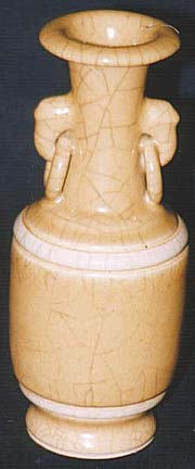 高さ24.2cm、口径7.7cm、胴径10.4cm、底径7.3cm 像の雙耳に浮游環を施した清朝民窯の哥釉青磁瓶で あり、この薄い茶色系青磁と白色系青磁を組み合わせ や、更に褐色の鐵釉で切り返しを施した民窯青磁は、 咸豊から同治にかけて多く作られている。本品は、茶 色系青磁の色調及び全体の形態から清朝晩期作品と 判断される。肩と足の部分がそれぞれ白色系青磁で切 り返してあり、高台内は茶色系青磁が施してある。ただ 残念ながら口縁の一部分が2cm弱に渉って二つに破 損し、接着剤で補修されている。 |