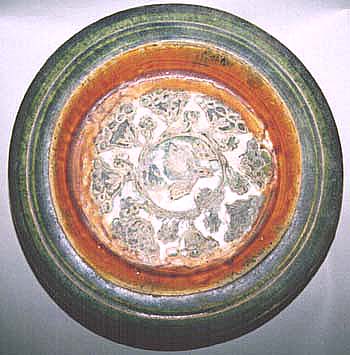 深さ2.5cm、内径18cm、外径25cm 本来は、盤の底裏面に丸環の三足が有ったはずである が、既に二本が脱落して無く、最後の一本も剥離したた め、ただの盤になった。三彩とは言うものの実際は二彩 に近い。一見発掘物としての「カセ」が目立つが、これは 人工的に付けられた「カセ」である。三足盤の遺品は多 々有るが、寡聞にして本品の如き幅広の鍔縁の盤は見 たことが無いし、緑釉の色調も当時とは異なる。形態的 に言えば、唐三彩が持て囃され出した時期の倣品であろ う。 |