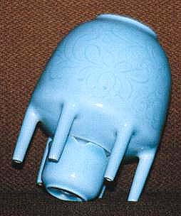 総高15cm、蓋高4.2cm、蓋径3.5cm、管高4.3cm、 管径0.8cm、肩径11.2cm、底径5.5cm、銘「水母」 実に不思議なものである。多嘴壺の一種である管口壺であ るが、青白磁の遺例は見当たらない。管口壺は五代時代の 白磁に六管口壺の遺例が有るものの、宋代に入ると遺例 の殆どが越窯や龍泉窯の青磁で、しかも五管口壺である。 中央の口に屋根や蓋を乗せる形態は五代から北宋にかけ て見られ、北宋の管は腹部に通じていないが南宋の管は腹 部に通じている。本品は、蓋と管は五代を模し、腹部の片刃 線刻紋は北宋様式で、管が通じている様は南宋的である。 管口壺のそれぞれの特徴を取り込んだ、「現代青白磁オブ ジェ」として見れば、それなりに面白く楽しい形態だと言えよ う、因って「水母」と命名した。倣品には倣品の面白さが有り 民國時代までは「如何に本歌に真似るか」一点一点技を競 った様な部分も見受けられるが、近年の倣品は倣品と言う のも憚られる様な「売らんかな」の新物の反乱で、一つ梅瓶 を作れば同じ形態の青花・釉裏紅・掻き落とし・三彩が登場 すると言う具合で、本歌が有ろうが無かろうがお構いなしと 言う状況である。本品も本歌は存在しないが、それでも意匠 が面白いから許せると言う程度である。 |