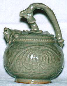 倣北宋耀州窯青磁刻花寳相華唐草文提梁倒灌壺(現代、AD1990〜2000)