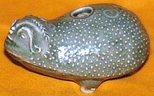 総高4.5cm、横幅9.5cm、縦幅6cm、足高0.5cm この様な形態の水注は、既に宋代から青磁や青白磁で 作られており、以後連綿として製造されているが、本品は 胎土・釉調等から、清朝後期の龍泉窯ものと判断される。 しかし残念なことに失敗作である。本来は口の両脇に小 穴を空けて水注とすべきであったが、その穴を空け忘れ ており、水盂としても背の中央の穴が小さすぎて杓が入ら ず、一体何に使えば良いのか不明である。 |